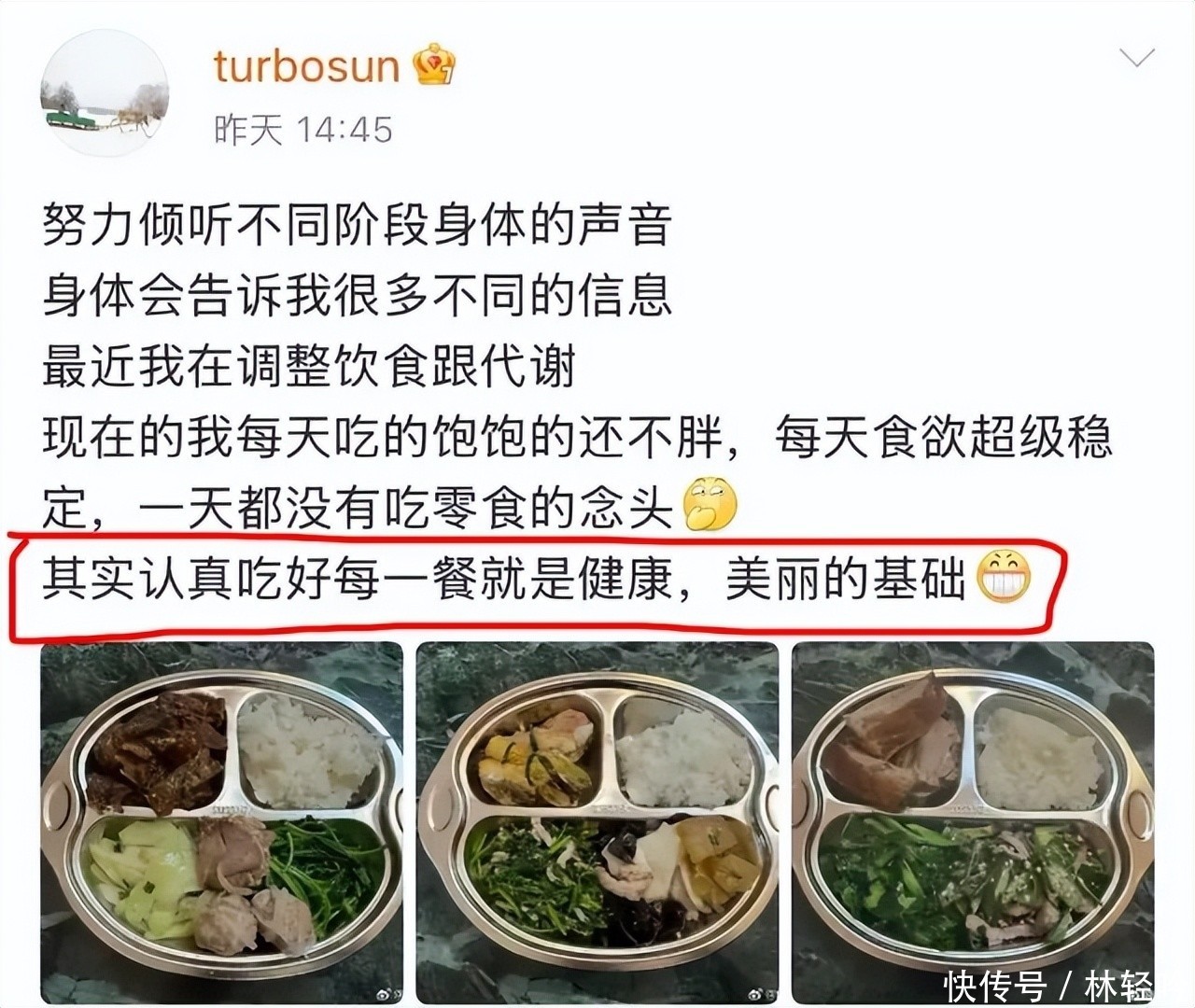45. 她常在社交平台分享自己的“干净饮食”:荤素搭配、粗细结合、营养均衡;同时常年坚持规律锻炼,保持良好的体能与精神状态。